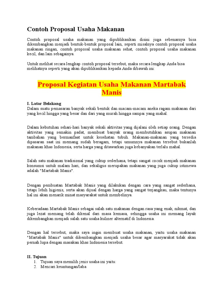 Hal ini dimaksudkan agar bisnis usaha makanan dapat berjalan sukses kedepannya. Puji dan syukur kami panjatkan kepada alloh swt karena atas rahmat dan keridoannya,kami bisa membuat suatu gagasan usaha yang insya alloh akan bermanfaat bagi kami sebagai pemilik usaha, investor. Contoh proposal usaha banyak dicari untuk menjadi rujukan para calon pengusaha muda. Cara membuat martabak mini : Dalam suatu bidang usaha, tentu harus memuat estimasi modal dan analisis swot yang berbeda. Sekian ya teman teman contoh proposal usaha kewirausahaa, kalau kalian mau tau lebih tentang surat surat tentang. Analisa peluang usaha setiap kegiatan untuk memulai usaha, maka hal yang harus dilakukan. Telur 2 kg rp 14.000 3. Pada bagian contoh proposal usaha makanan lokasi usaha ini juga wajib untuk anda jabarkan dengan jelas. Contoh proposal jualan makanan tags. Peluang usaha darimartabak telur mini ini memang cukup mencenangkan dan cocok sebagai suatu ide usaha yang cemerlang. Dalam menawarkan investasi usaha, semakin lengkap dan detail kerjasama yang ditawarkan memang akan meningkatkan peluang kesepakatan kerjasama. Terigu 2 kg rp 14.000 2.